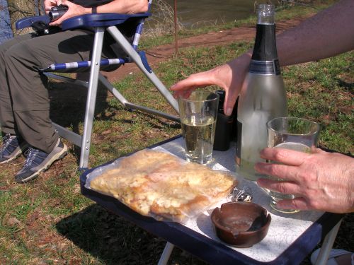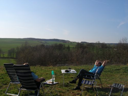 Klasse. Herrliche Ruhe, rundherum Natur, die Sonne scheint. Hier kann mans aushalten. Nach einer Stunde treffen auch Wiebke und Konrad ein und wir begießen den Wochenendbeginn mit einem gepflegten Bierchen.