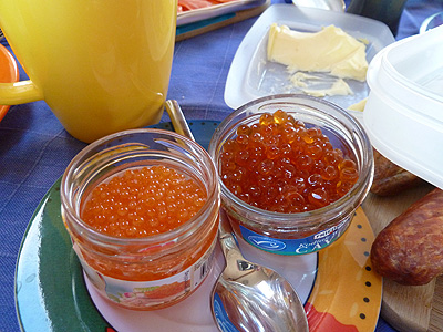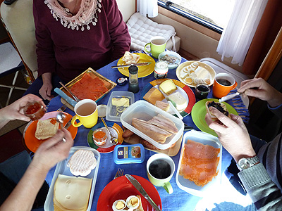 Wiebke hat den Frühstückstisch gedeckt und jetzt gibts Geburtstagsfrühstück mit Wildlachs, norwegischem Seelachs, Forellen-, Lachs- und Seehasenrogen, Forellenfilets, fränkischer Wurst, französischem Käse, dänischen süß-sauren Heringen, bretonischer Entenpastete und holländischen Eiern.