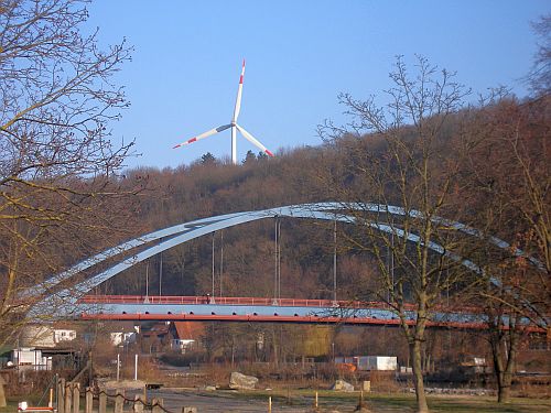 Brücke und Windrad passen wie Faust aufs Auge in die Landschaft. Blick von der anderen Mainseite auf den Stellplatz.