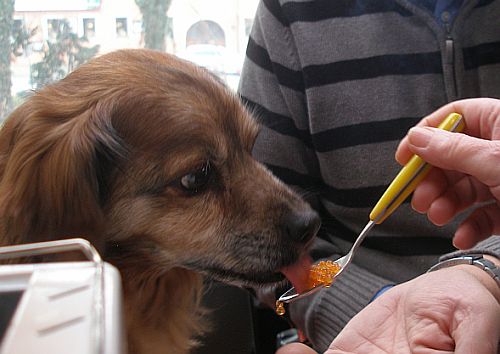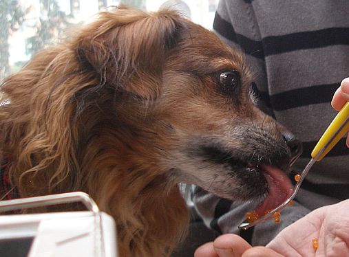 Und Bruno bekommt auch was ab, denn Kaviar findet er lecker. Wenn die Eier nur nicht so glitschig wären.