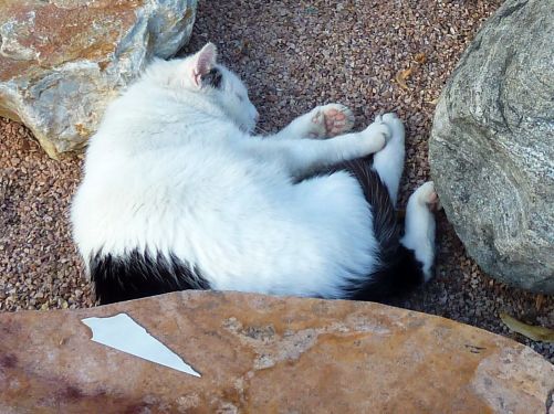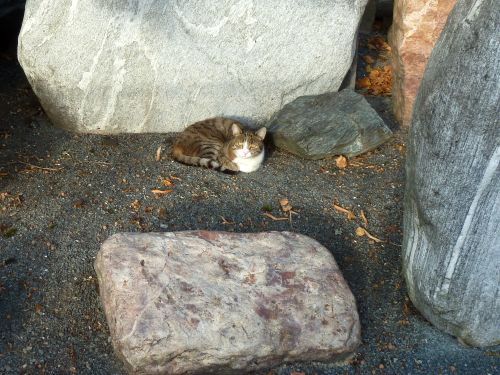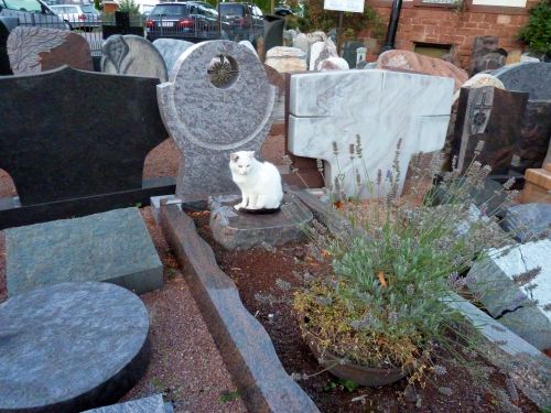 Auf dem Rückweg kommen wir bei einem Steinmetz vorbei und entdecken zwischen den Grabsteinen Katzen, die sichs gemütlich gemacht haben und die Wärme der Steine genießen. Scheinbar liegen sie dort gut getarnt, denn Bruno entdeckt sie garnicht.