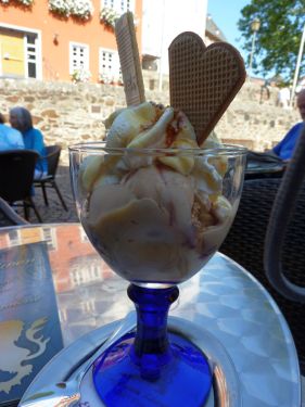 Leider hat mein Eierlikörbecher jede Menge Nüsse und Krokant drüber, eine harte Probe für mich, die ich aber mit viel Geduld und Feingefühl meistere.