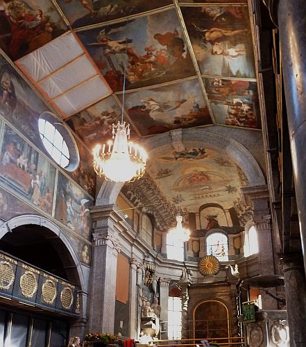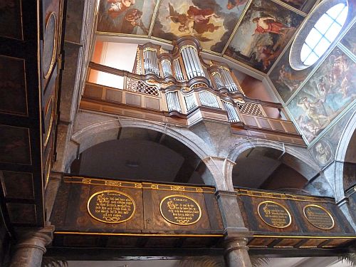 Leider ist sie im Moment für Besucher gesperrt, da Proben für morgen stattfinden. Die Ode an die Freude kann doch nicht so schwer sein, dass ich da nicht stören könnte. Also bin ich einfach leise reingeschlichen und hab mir mal schnell das Innere angeschaut. Sogar die Decke ist mit Ölgemälden auf Leinwand verkleidet. Hier haben sich Rubensschüler ausgetobt. Irgendwann müssen wir hier nochmal her, denn sowas muss man sich in Ruhe anschauen.