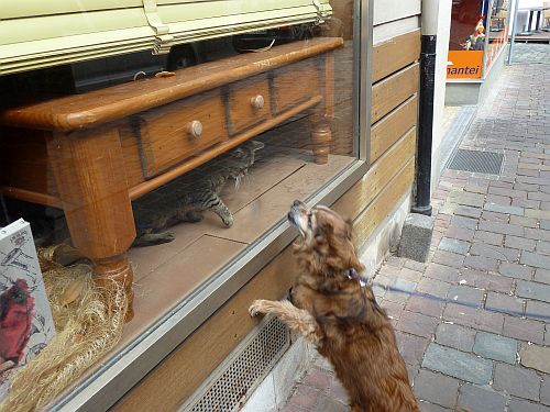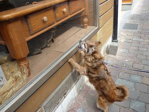 Bruno hat ein Schaufenster mit Mieze entdeckt und lautstark seiner Freude Ausdruck verliehen, denn er hat Miezen zum Fressen gern.