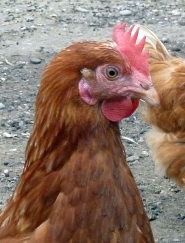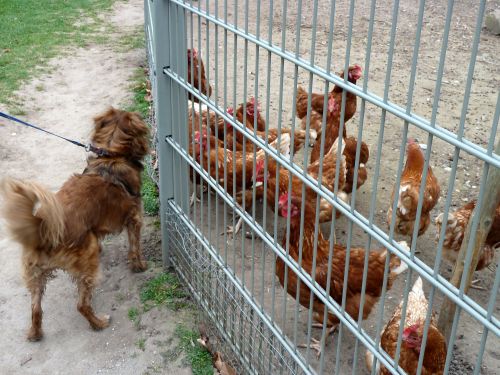 Hier sieht Bruno im hohen Alter von 13 Jahren erstmals Hühner aus der Nähe. Im Schrebergarten hat er sie immer nur gehört, denn der Nachbar hatte vorsichtshalber einen Sichtschutz angebracht.