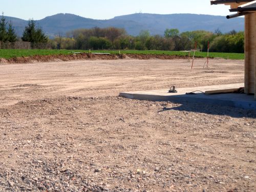 Nach dem Frühstück nutzen wir das schöne Wetter noch etwas aus und laufen am Bachlauf entlang zur Baustelle des neuen Stellplatzes.