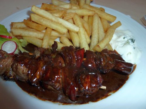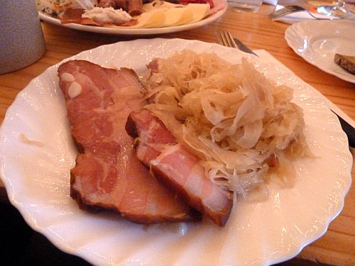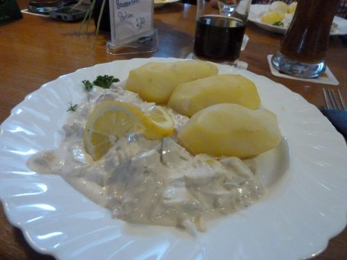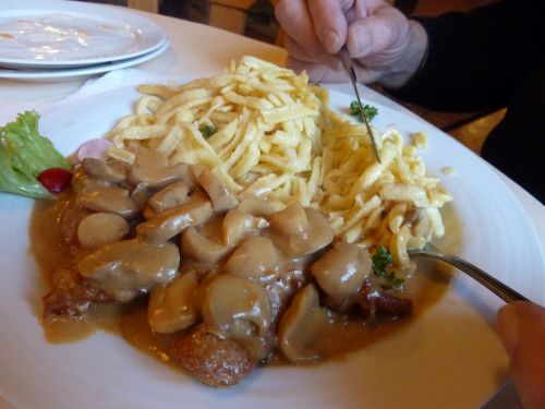 Peter und Konrad essen Jägerschnitzel, Wiebke und ich Lammspieße. Sehr lecker. Und außerdem wars praktisch, denn so ein kleines Osterlämmchen berührt einen doch und könnte ich nicht wirklich genießen, aber als Spieß getarnt schmeckts ohne schlechtes Gewissen.