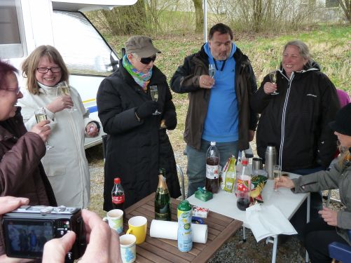 Inzwischen haben die Männer die Womos startklar gemacht und wir fahren weiter nach Röttingen zum Weingut Bach, wo wir uns mit Frauke, Vulcanizza und den Hasis treffen. Sie sind alle schon da und auch schon feste am Feiern.