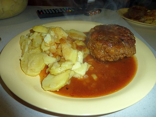 Zunächst fahren nach dem Bekanntmachen alle zu Essen in die Pizzeria, also sie werden in PKWs verladen, während wir Frikadellen und Kartoffelsalat essen, weil ich ja noch im Teststadium meiner neuen Kauleiste bin und sowas nicht als öffentliches Event feiern möchte.