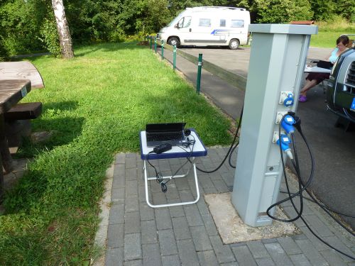 Der Akku meines Läppis macht leider die Grätsche, und weil wir ja ohne Strom stehen wollen, häng ich ihn kurz an die Stromsäule, denn auf einem Anschluss sind noch 50 Cent drauf.