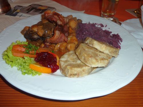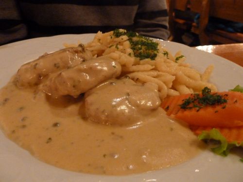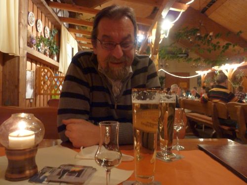 Wir werden fürstlich verköstigt, Schweinemedaillons in Pfefferrahmsoße und Wildhasenkeule in Rotweinbeize mit Steinpilzen. Es gibt hinterher lecker Schnäpschen, hausgebrannt aus Kahlgrundobst, alles ist gut. Schmegge musses.