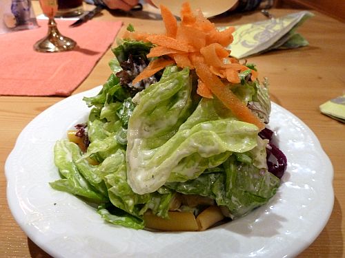 Zuerst bekommt jeder ein Salattürmchen, von dem Bruno meine Karotten kriegt, und dann kommt das Hauptgericht: