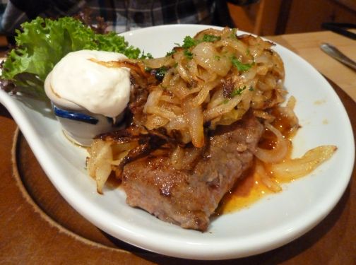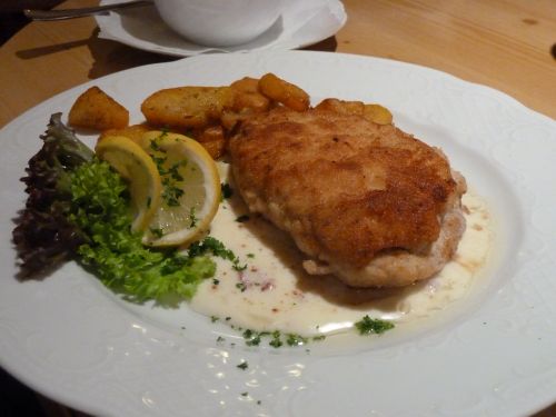 Rumpsteak für Konrad und Poppenhäuser Saftsäckchen für Peter. Das ist ein sauerkrautgefülltes Doppelschnitzel.