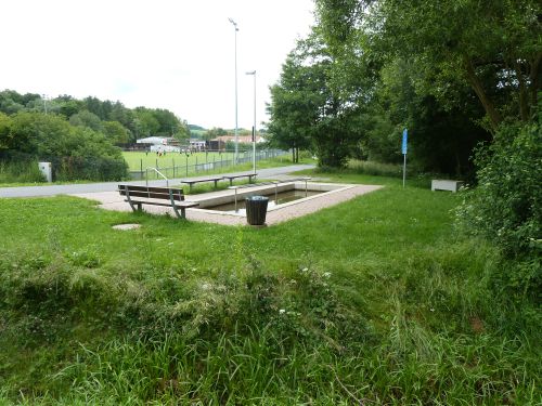 haben hier den Blick auf Hof Schabernack, kommen am Kneipp-Becken vorbei und gehn wieder zurück.