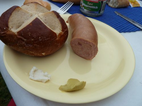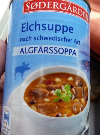 Zum Abendessen gibts Elchsuppe aus der Dose, Krakauer und Knobifleischwurst mit frischen Brötchen.