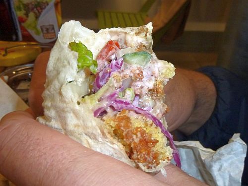 Jetzt haben wir Hunger und finden in einer Seitenstraße einen türkischen Imbiß, wo wir sogar draußen sitzen können. Es gibt Dürüm mit Falafel und Halloumi.