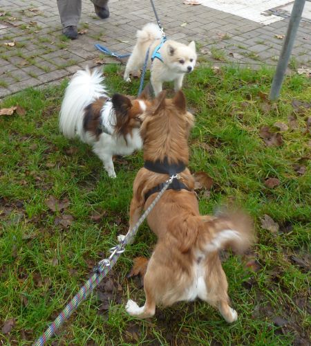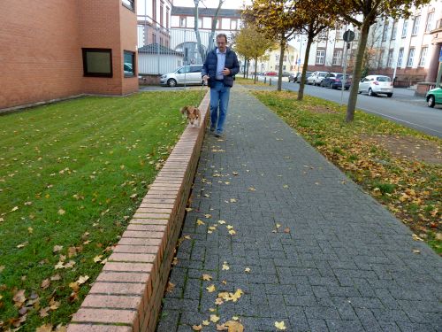 Die haben noch keine Zeit gefunden, nach der Landesgartenschau die Zäune zu entfernen und wir mussten die Straße entlang spazieren. Und weils der einzige Weg hier ist, begegneten uns jede Menge Hunde. Und die hier habens Carl besonders angetan.