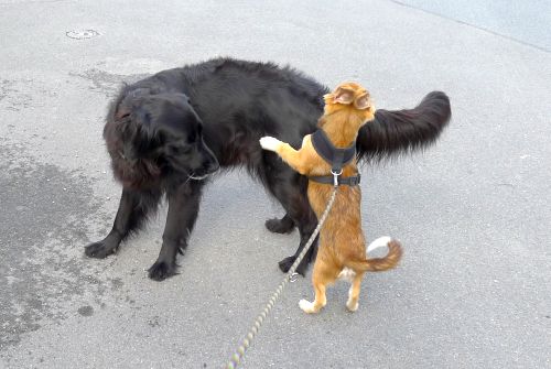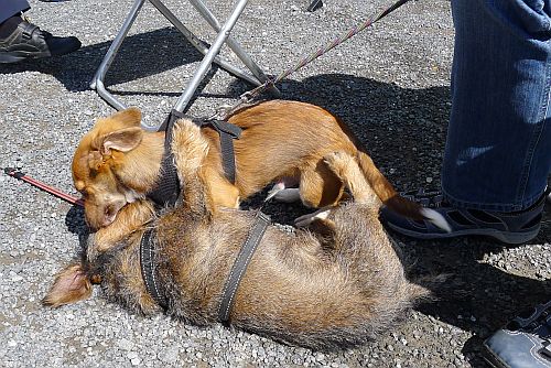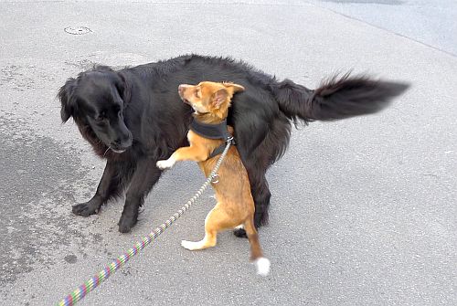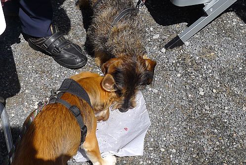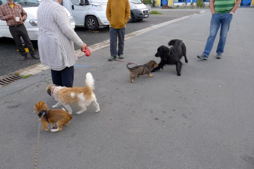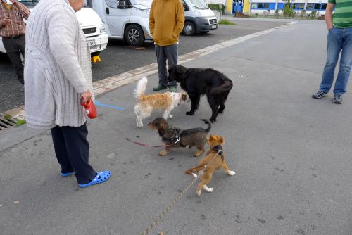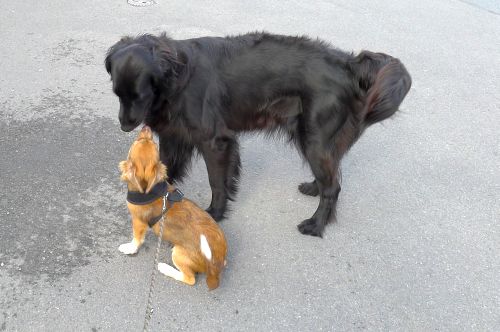 Allgemeine Begrüßung, und auch die Hunde machen sich miteinander bekannt. Passt auch.