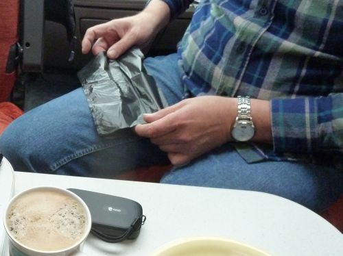 Wieder zurück im Womo gibts Cappu und Marmeladebrötchen, und Peter faltet Kacktüten wie in alten Zeiten.