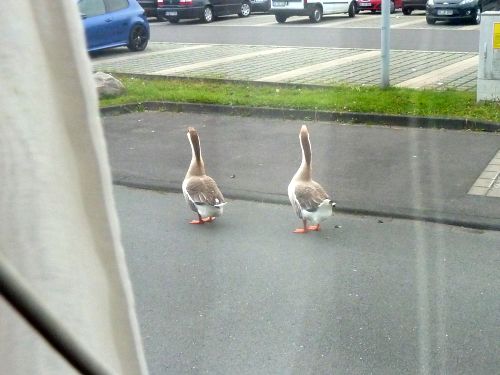 Auf dem Stellplatz laufen fette Bratentiere herum,