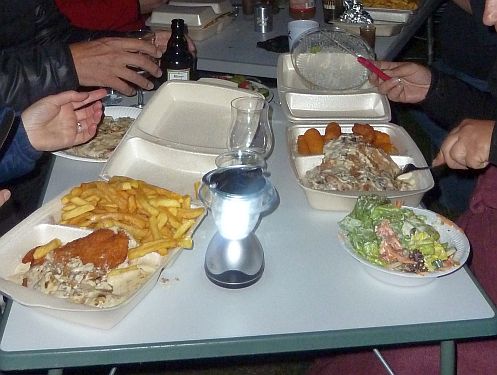 Der gemütliche gemeinsame Abend endet, als es anfängt zu gewittern, und als der Regen dann auch noch kommt, verziehen wir uns.