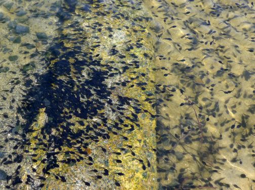 Gegen später gehn wir noch kurz in den Wald und dann schauen wir uns das Schwimmbad an. Der gesamte Uferbereich des Sees ist schwarz vor lauter Kaulquappen.