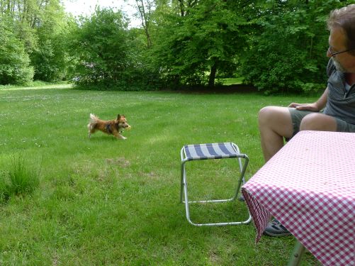 Doch jetzt sind wir glücklich, denn wir haben den besten Platz der Welt. Die Wiese gehört ganz alleine uns, durch die Büsche sehen wir sogar das Wasser, Carl kann ohne Leine sein, und alles ist gut.