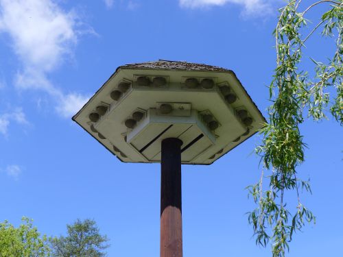 Am Ortseingang steht diese Hochhaus für Schwalben, und es sind tatsächlich welche drin.