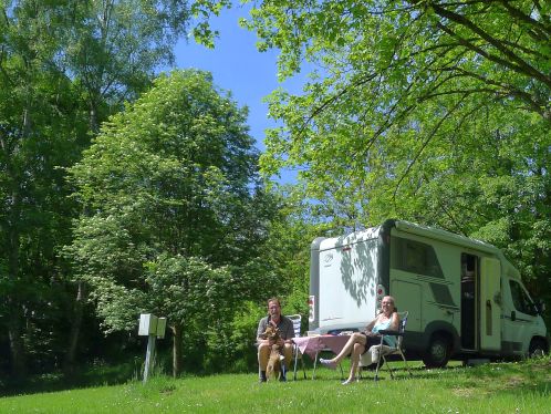 Die Wiese unten am Wasser war uns zu schief, deshalb stehen wir jetzt oben und sehen nur Bäume. Aber erst mal egal, heute sitzen wir eh nicht mehr draußen.