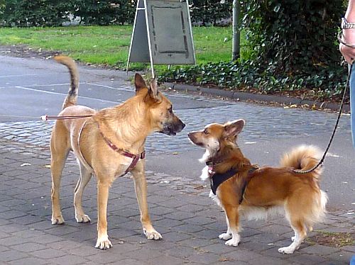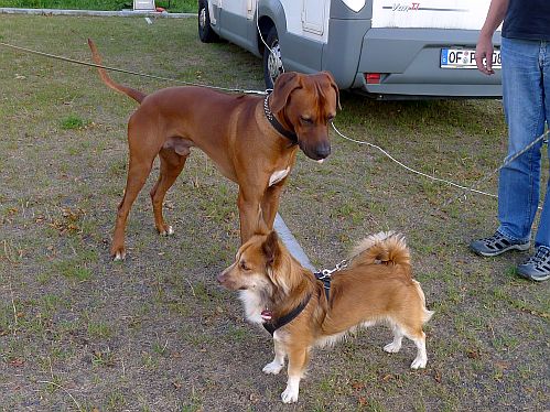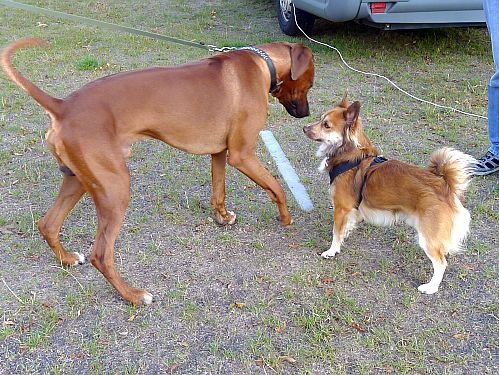 Ein Prachtexemplar von Rhodesian Ridgeback. Carl ist im Gegensatz zu uns kein bißchen beeindruckt von der Größe und sagt ihm deutlich, dass er sich nicht am Bobbes schnuppern lässt. Ganz schön mutig der kleine Kerl. Ich musste mich allerdings aus der Gefahrenzone begeben und hab mich mit Frauchen unterhalten und die Männer haben das unter sich ausgemacht.