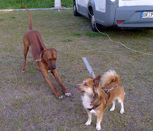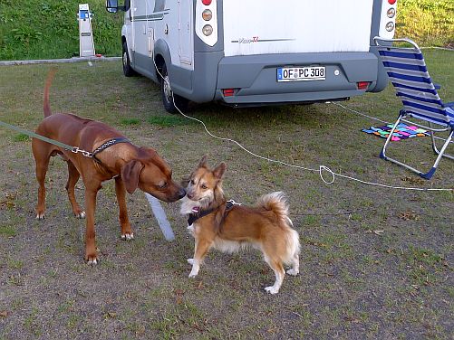Inzwischen haben wir Stellplatznachbarn bekommen und Carl lernt erst mal deren Paul kennen.
