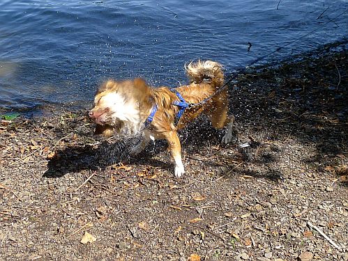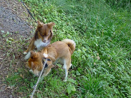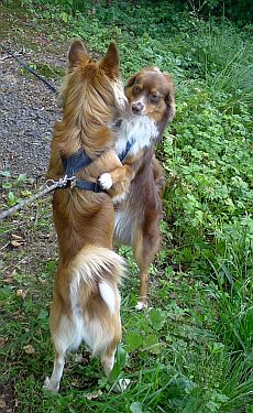 Carl hat auch seinen Spaß, denn wir treffen unterwegs viele Hunde. Hier ein kleiner Aussie, den er gleich ins Herz geschlossen hat.