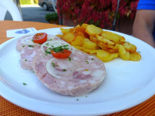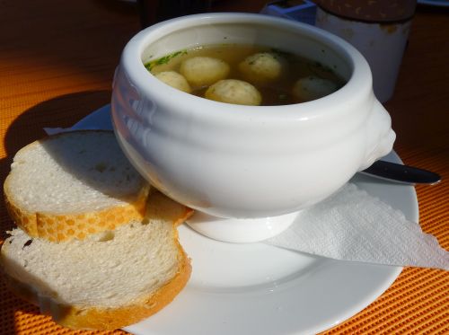 Peter hatte Presskopf in Essig und Öl, sehr interessant, und ich eine Markklößchensuppe. Carl bekam eine große Schüssel Wasser und mein Brot und war glücklich.