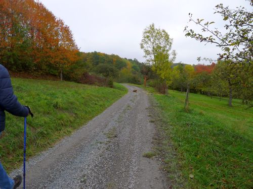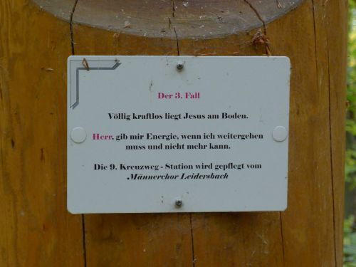 Durch Streuobstwiesen und kleine Wäldchen gehts immernoch weiter bergauf. Und immer wieder kommen wir an einer Kreuzwegstation vorbei. Manche passen wunderbar zu meinem körperlichen Zustand.