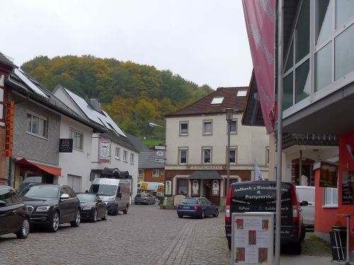 Der Stellplatz in Leidersbach ist gerade durch ein Kanalreinigungsfahrzeug blockiert, also schauen wir uns zwischenzeitlich mal die Ortsmitte des längsten Straßendorfes, das wir je gesehen haben, an. Man nennt diese Strecke auch Sakko-Canyon, weil hier ein Bekleidungsgeschäft am anderen sitzt. So auch der größte Brautmodenhersteller Brand. Aber den brauchen wir nicht.