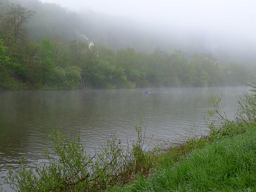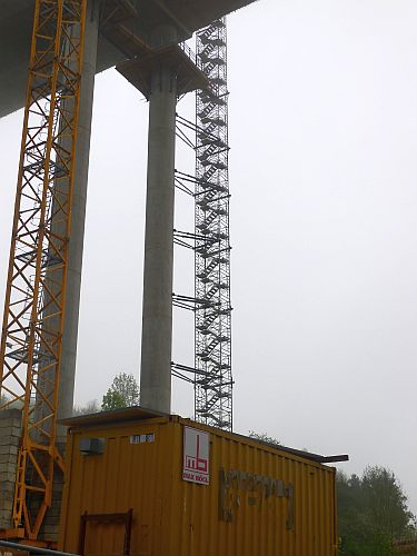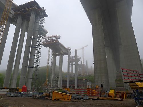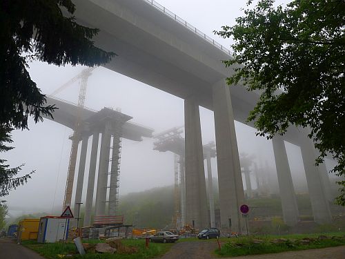 Morgengassi im Frühnebel zur Autobahnbrücke hinter dem Campingplatz. Es ist schon Wahnsinn wie kompliziert so ein Brückenbau ist.
