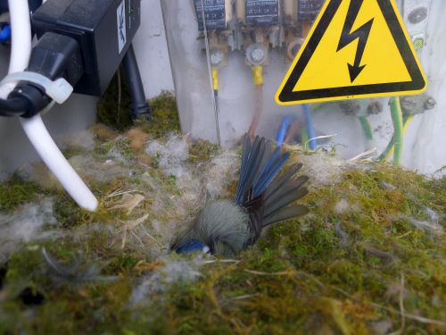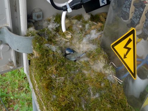 Sogar der Stromkasten ist vermietet. Ein riesiges Nest für so ne winzige Blaumeise.