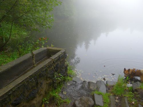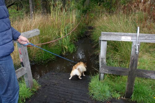 An der Moorbadestelle darf Carl nur mal kurz einen Schluck nehmen, baden ist ihm nicht erlaubt, einen Moorhund wollen wir nicht im Auto haben.