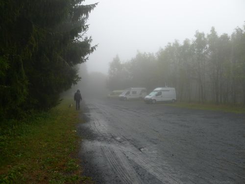 Es hat die ganze Nacht geregnet, pünktlich zum Morgengassi hats aufgehört. Nach dem Frühstück starten wir in Richtung Basaltsee. Unterwegs begegnen wir den Schweizern, mit denen Ina gerade eine Ausfahrt macht. Kurz drauf zieht das Wetter zu und der Basaltsee ist kaum zu sehen.