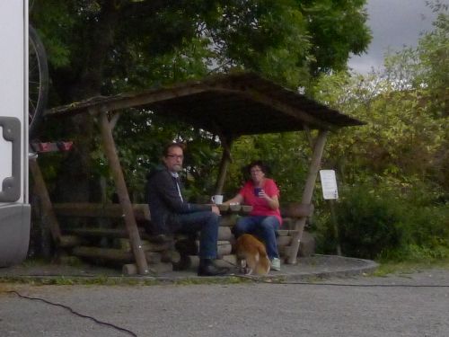 Jetzt stehen wir hier, machen uns erst mal nen Irish Coffee und genießen unsren Mohnkuchen. Dann nochmal ein Hundegassi und wir kommen bei Flairmichel und Rainer, dem Mann von Mary-Jo vorbei. Die Welt ist echt klein. Drei Begegnungen an einem Tag.