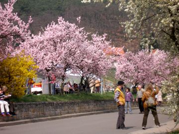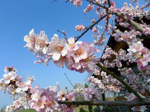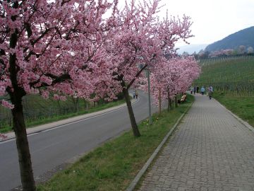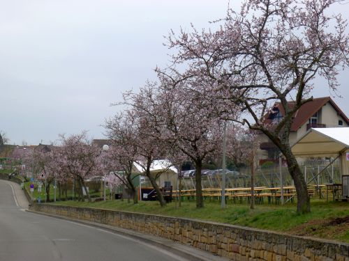Um hier zu bleiben - es gibt einen schönen Stellplatz - ists aber noch zu früh und wir fahren weiter nach Gimmeldingen, nach den blühenden Mandeln schauen. Das Mandelblütenfest ist wegen der Wahl erst nächste Woche und wir bekommen noch einen Platz in Mußbach. Aber ohje, es scheint zwar die Sonne, doch der Wind ist kaum zu ertragen, so kalt ist er. Also verschieben wir die Mandelmeile auf morgen und holen uns beim Rewe-Bäcker erst mal Himbeer- und Erdbeertorte, und zum Nachtisch einen Granatsplitter, den wir uns teilen.