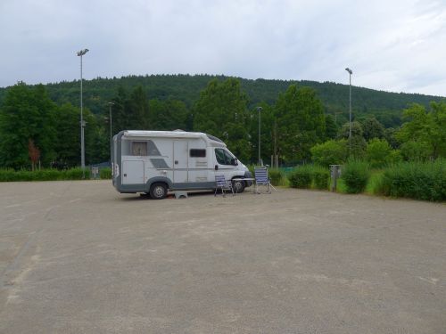 Heute ists noch wärmer als gestern und hier gibts weder Baum noch Strauch. Außerdem haben wir über Nacht einen Nachbarn bekommen, der bei offenen Fenstern sein Kind per Computerspiel bespaßt. Wir sind ja normalerweise nicht empfindlich, aber schon die Hitze alleine reicht uns, also packen wir zusammen und verlassen nach dem Morgengassi und einem deftigen Frühstück mit Speck und Eiern Bad Orb. Aber wir kommen bald wieder, denn einen besseren Platz für meine Knie und Carl kennen wir nicht.