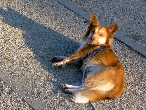 Nur ein müder Hund ist ein guter Hund.... Allerdings kriegt er trotzdem alles mit. Er ist aber so entspannt, dass ihn nicht mal Passanten mit Hund stören.