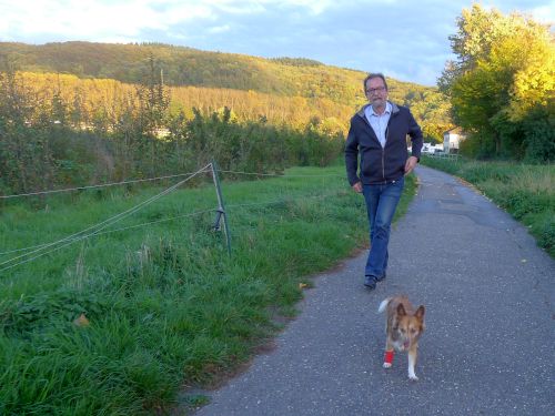 Zuerst machen wir mal ein Hundegassi. Aber nur ein kleines, denn Carl hat sich das rechte Handgelenk verstaucht und humpelt traurig vor sich hin.