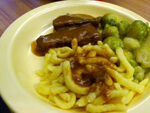 Es gibt Sauerbraten mit Spätzle und Rosenkohl. Das ist mein bescheidener Teller. Peter hatte natürlich bissi mehr Fleisch.