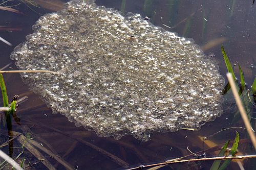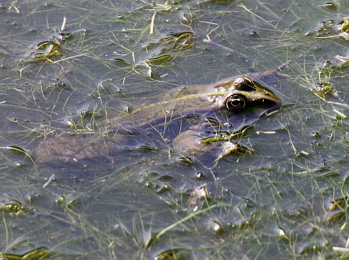 Am Teich nebenan ist auch noch Nachtruhe. Kein Frosch zu sehen. Die kleinen Kaulquappen haben sich alle untern Laich zurückgezogen und schlafen noch.