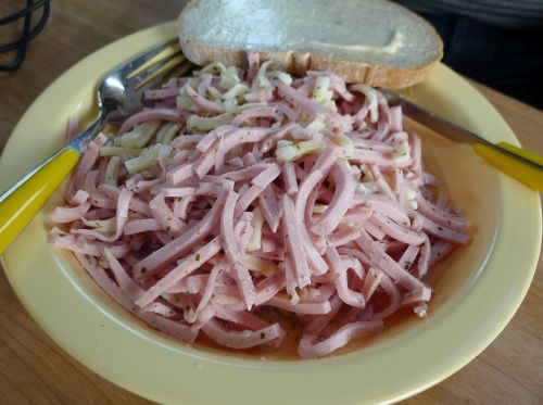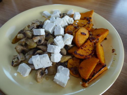 Süßkartoffeln mit Champignons und Feta Schweizer Wurstsalat und Butterbrot