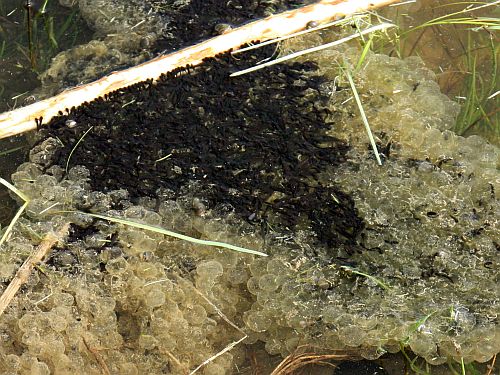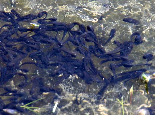 Die Frösche - sind wohl Grasfrösche - im angelegten Biotop nebenan sind fleißig dabei sich zu vermehren und in einem der beiden Laichklumpen sind die Kaulquappen wohl gerade geschlüpft. Vom Moderlieschen gibts noch nix zu sehen. Die wohnen im Teich nebenan.