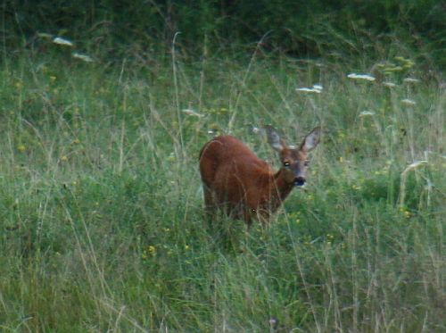 Und nach dem Abendessen kriegt ein Reh ebenfalls Hunger und frisst sich auf der gegenüberliegenden Wiese satt.