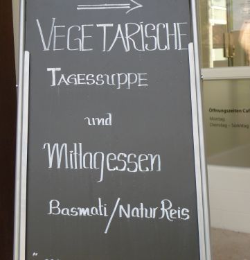 Ja, das Bild ist unten abgeschnitten, aber unbeabsichtigt, denn da steht wirklich nix weiter drauf. Das Hauptgericht ist tatsächlich Reis. Man kann aber als Beilage unter 3 Gemüsesorten wählen. Und um Anmeldung wird gebeten, steht ebenfalls auf einem Zettel an der Tür.